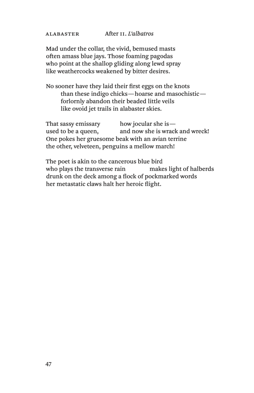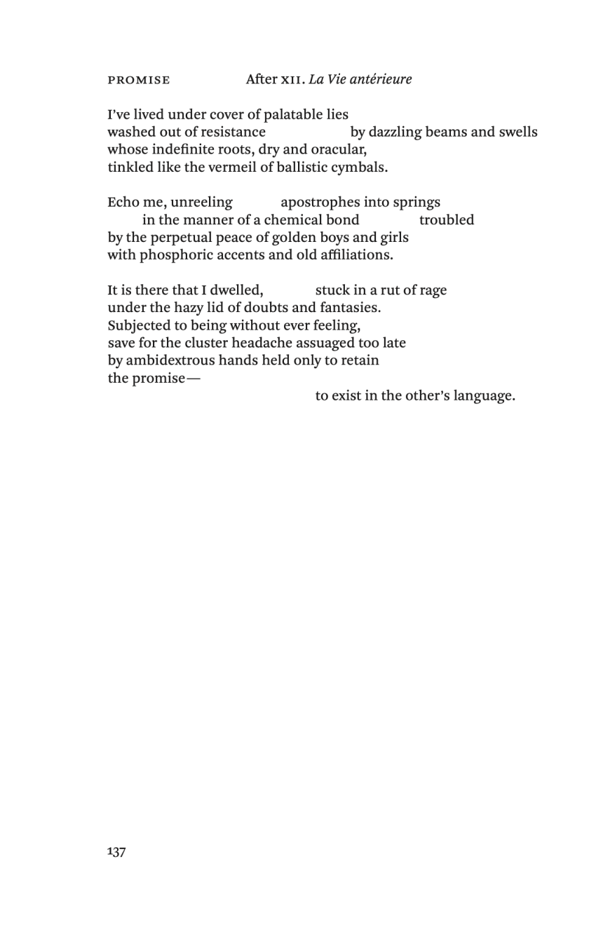 A suite of unfaithful translations / transversions of works drawn from Baudelaire’s Les Fleurs du mal / Flowers of Evil : a bunch of flowers in decay, pressed and frayed, ‘a flock of pockmarked words.’