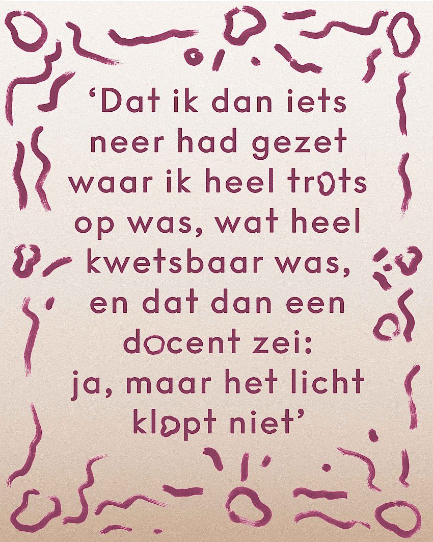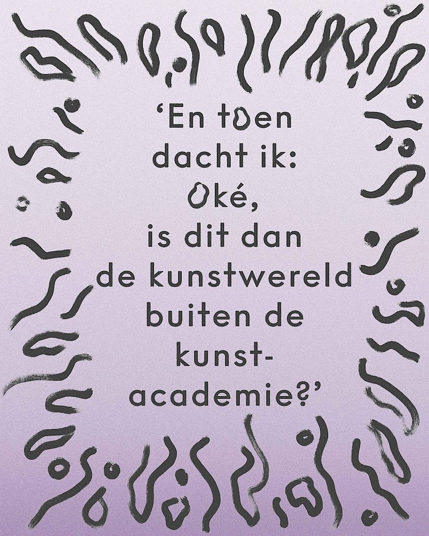 Fourteen emerging artists are about to make the leap from art school to the professional world. During this intense period full of conflicting emotions, they pause for a moment. How do they view art education, the art world and their own work? This new generation of artists will determine the art of the future. Who are they? What will they take with them into the future and what will they leave behind? For everyone who knows the art academy well and for everyone who has never set foot inside.