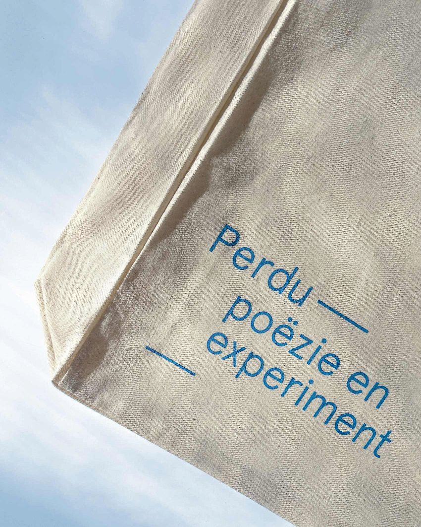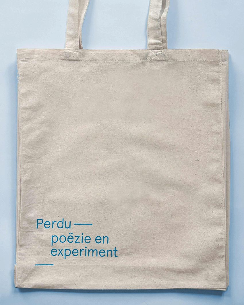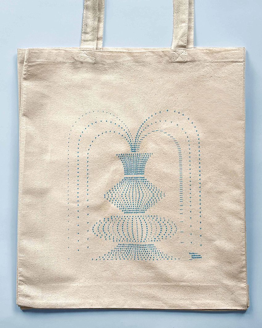 Tote bag for Stichting Perdu, concrete poetry fountain, h 43 cm x w 38 cm (handles ~ 33 cm). Now on sale in the bookstore!